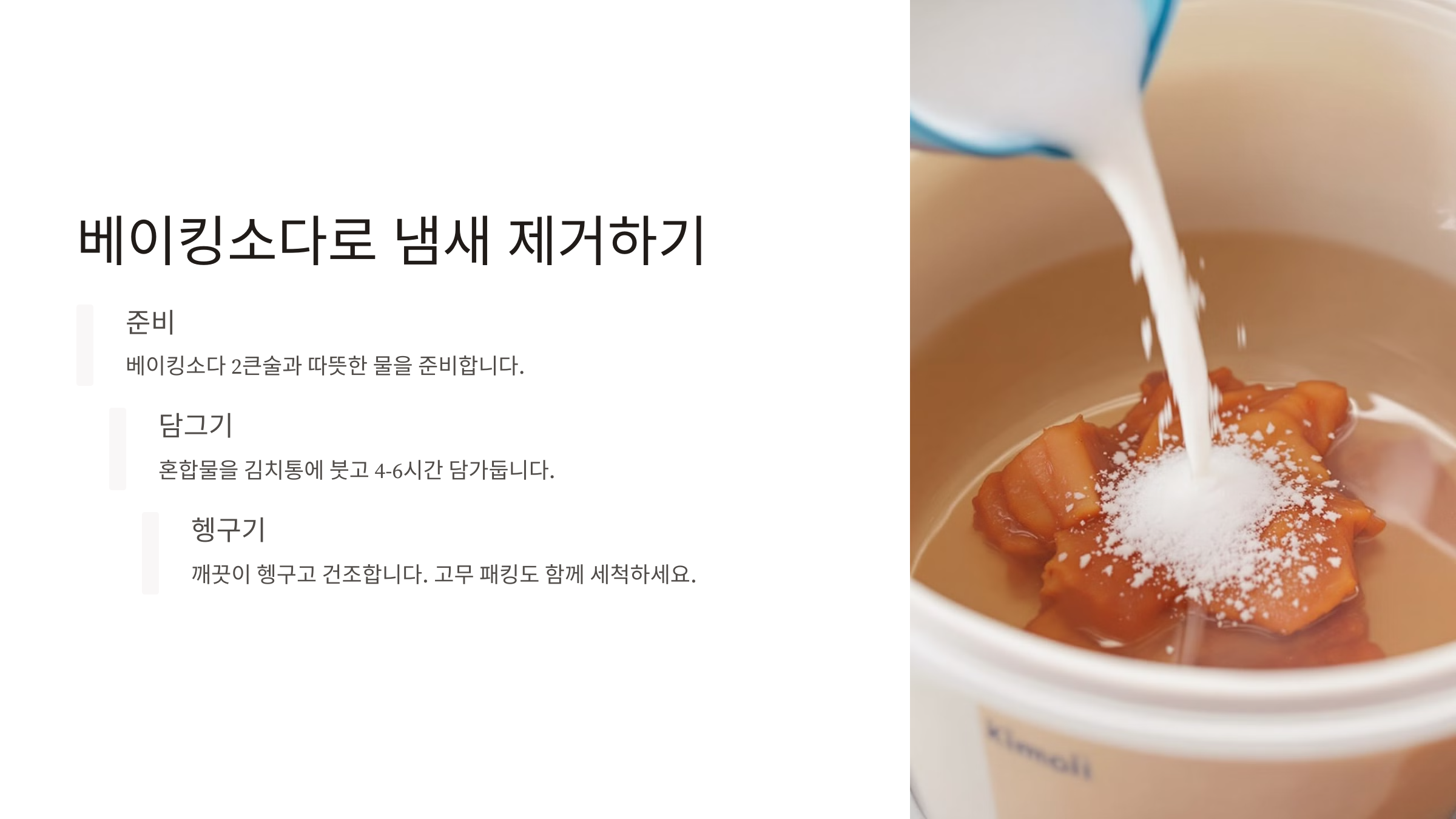 ✔ 방법: 베이킹소다 활용법 1️⃣ 김치통에 베이킹소다 2~3스푼과 따뜻한 물을 넣고 30분 동안 담가 둡니다. 2️⃣ 부드러운 수세미로 닦아주면 냄새와 함께 찌든 때도 사라져요! 3️⃣ 물로 깨끗이 헹군 후, 완전히 말려주세요. 😃