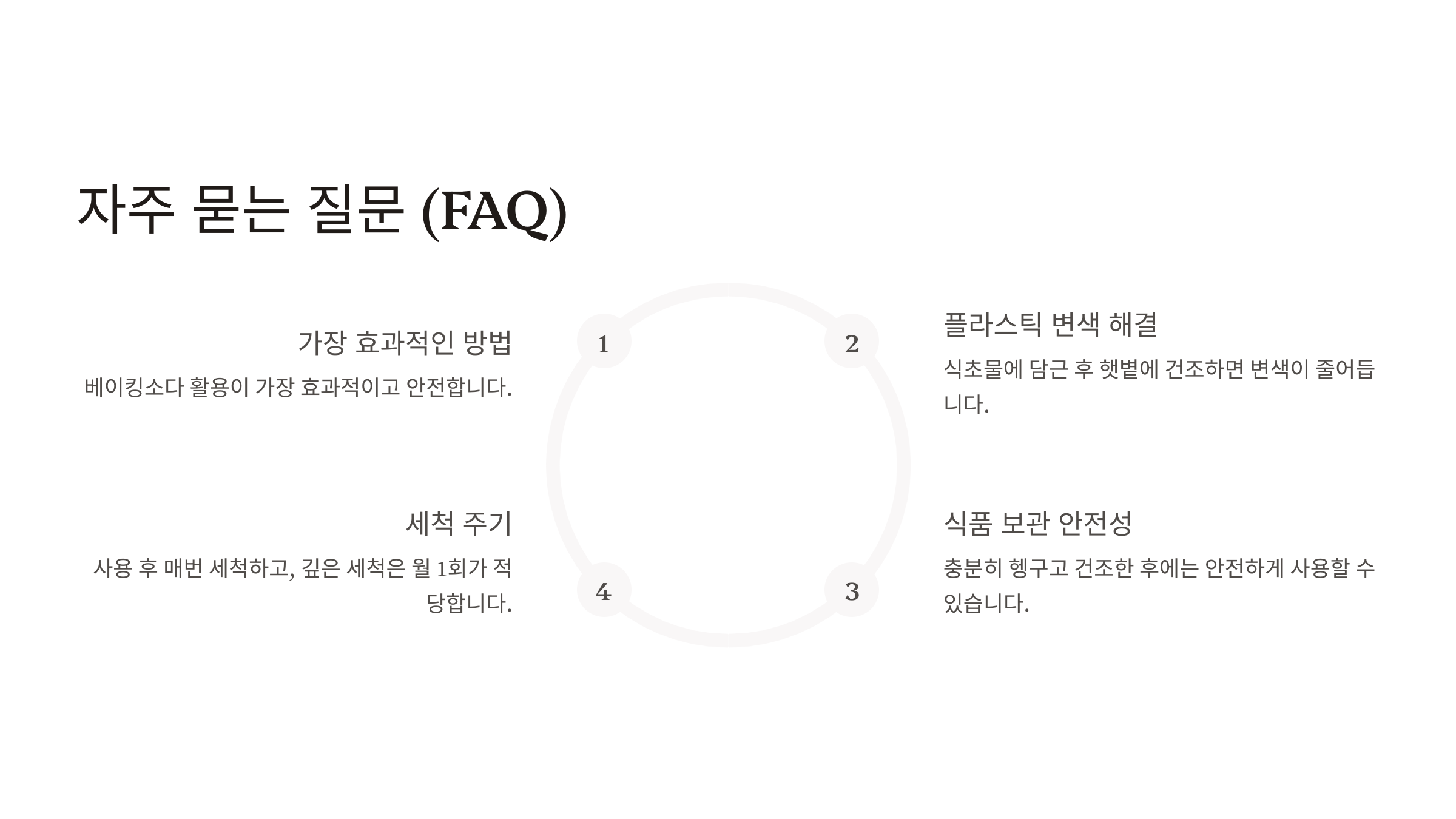 이제 김치통에서 냄새가 나지 않도록 예방하는 방법까지 배웠어요! 마지막으로 자주 묻는 질문(FAQ) 섹션을 확인해볼까요? 😊
