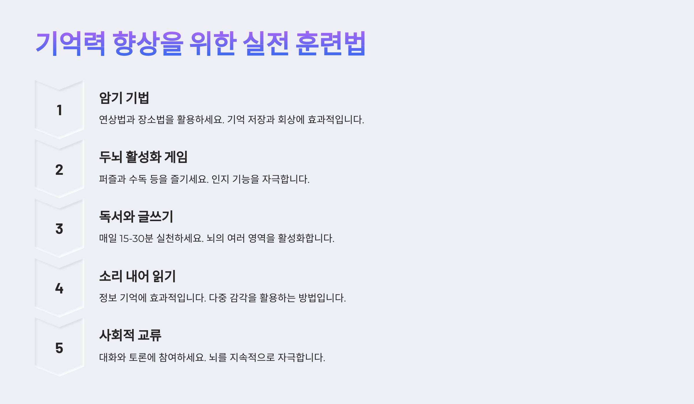 기억력은 단순히 좋은 음식을 먹고 운동한다고 해서 갑자기 좋아지는 것이 아니에요. 꾸준한 훈련을 통해 뇌를 지속적으로 자극해야 해요! 🎯
