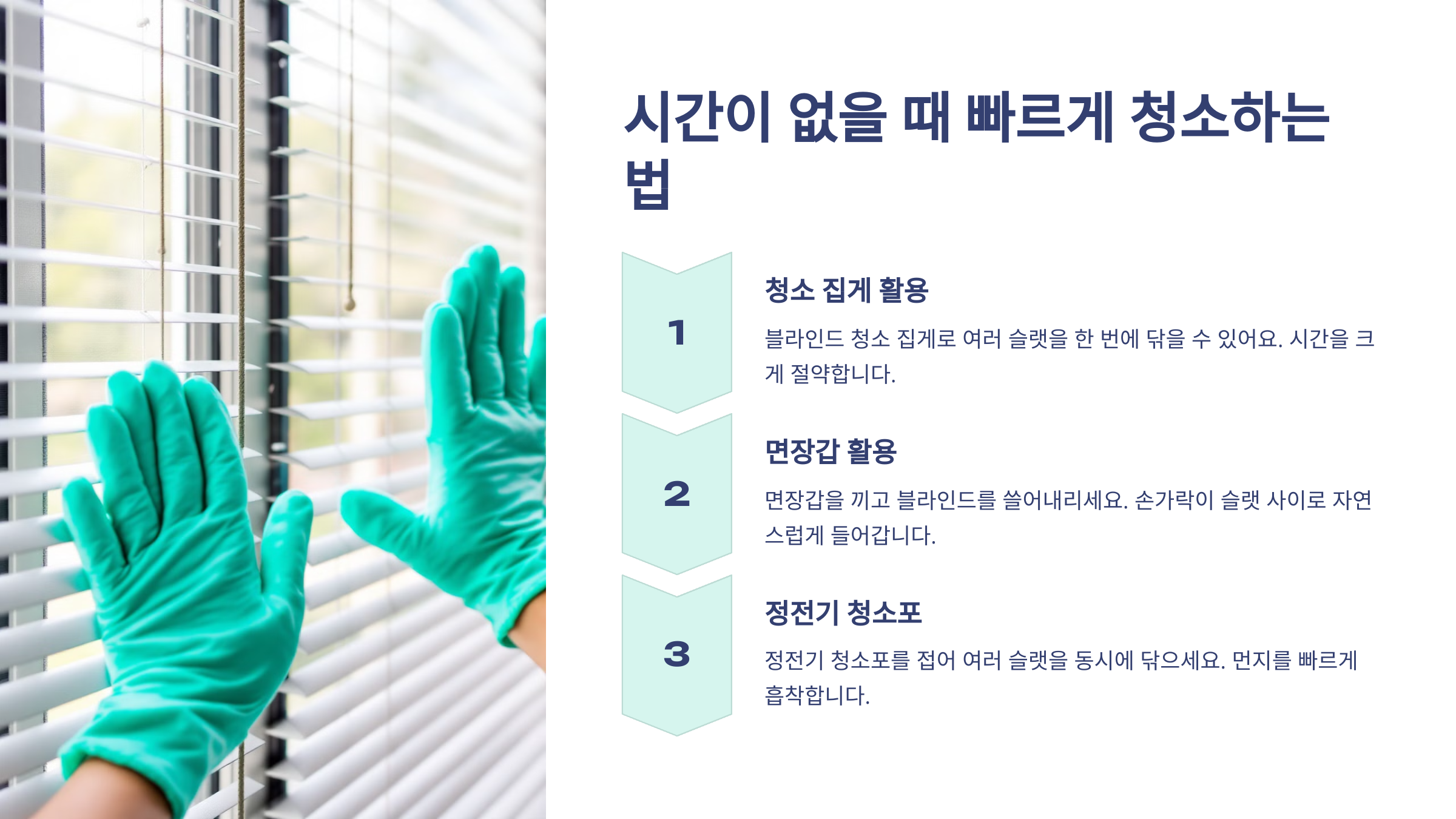 올바른 예방 습관을 들이면 블라인드를 더 오랫동안 깨끗하게 유지할 수 있어요! 하지만 시간이 없을 때 빠르게 청소하는 방법도 필요하겠죠? 다음 섹션에서 바쁜 날에도 빠르게 블라인드를 청소하는 팁을 확인해 보세요! ⏳