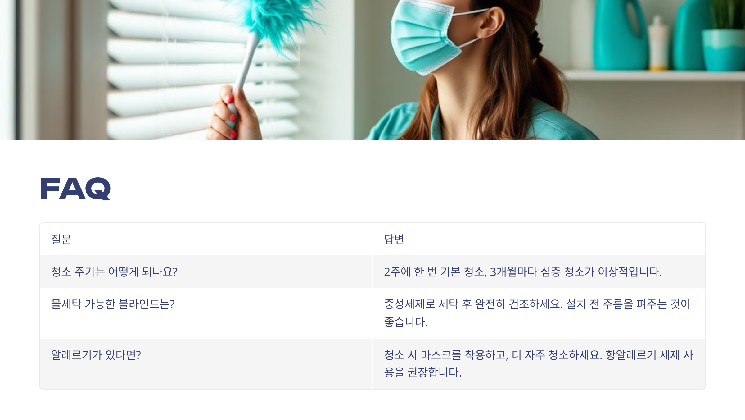 빠른 청소 방법을 활용하면 바쁜 날에도 블라인드를 깨끗하게 유지할 수 있어요! 마지막으로 블라인드 청소와 관련된 자주 묻는 질문(FAQ) 섹션을 확인해볼까요? 😊