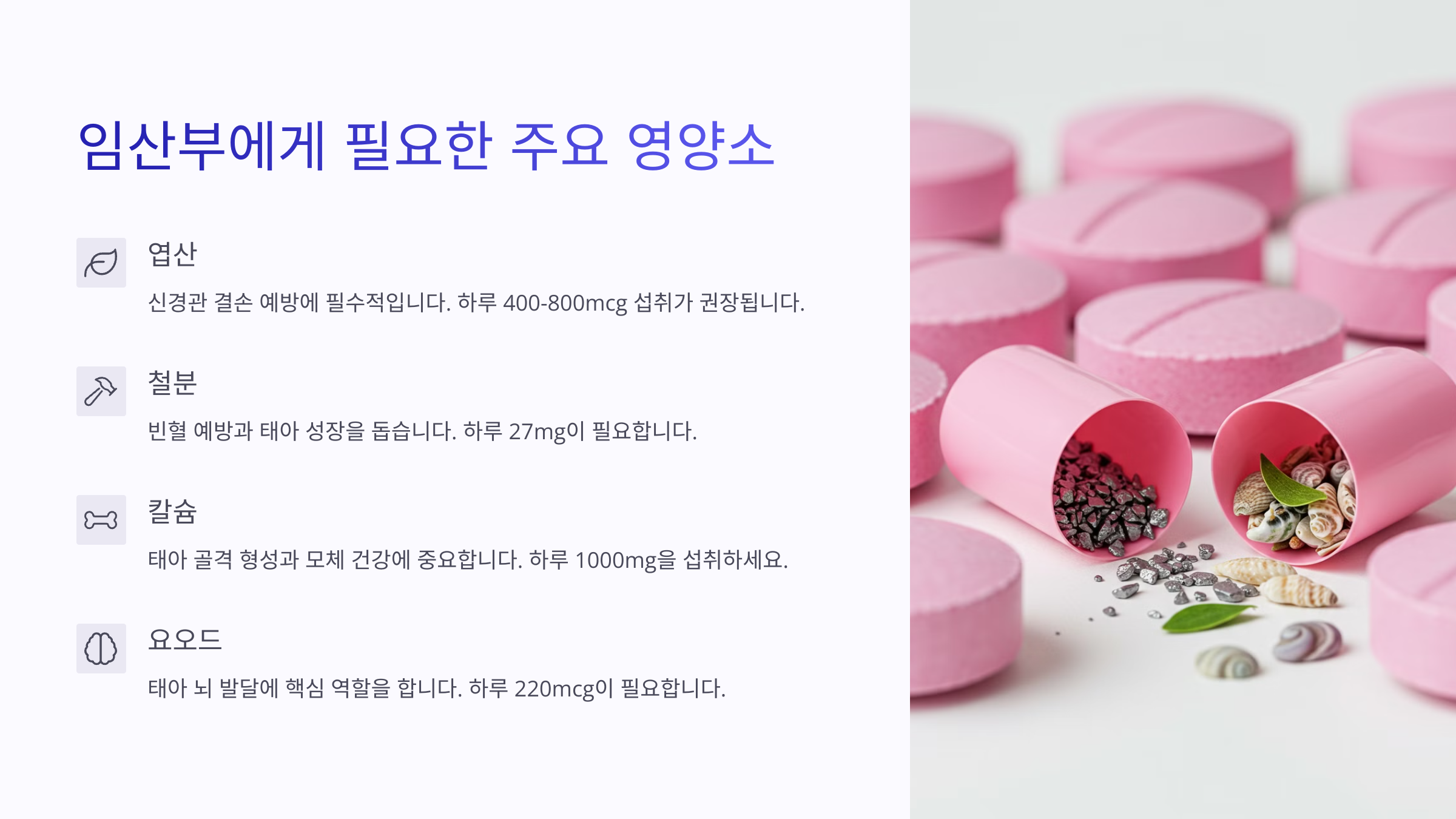 1. 엽산은 임신 초기에 가장 중요한 성분이에요. 태아의 신경관 형성과 기형 예방에 필수로, 임신 계획 단계부터 1일 400~600μg을 권장해요.
